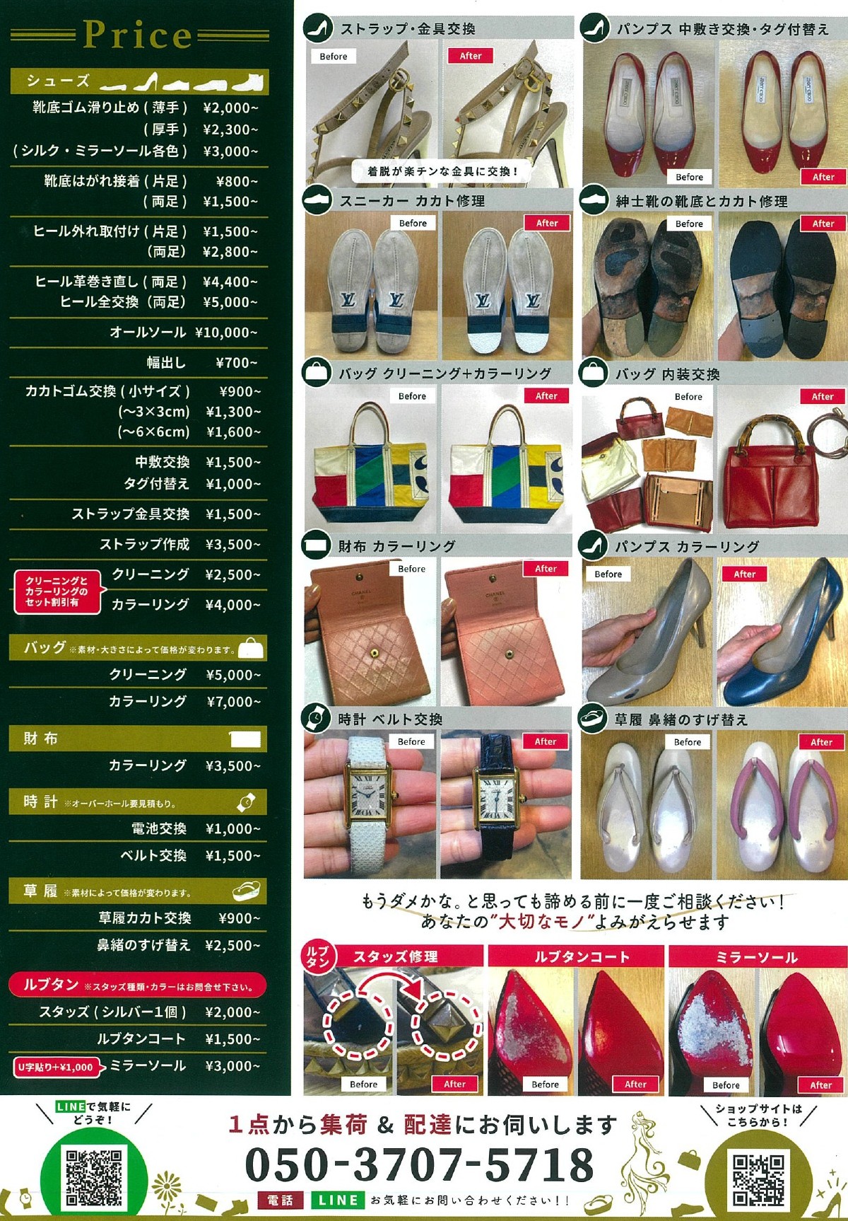 チラシ内容:靴、バック(時計、財布など)修理のご案内