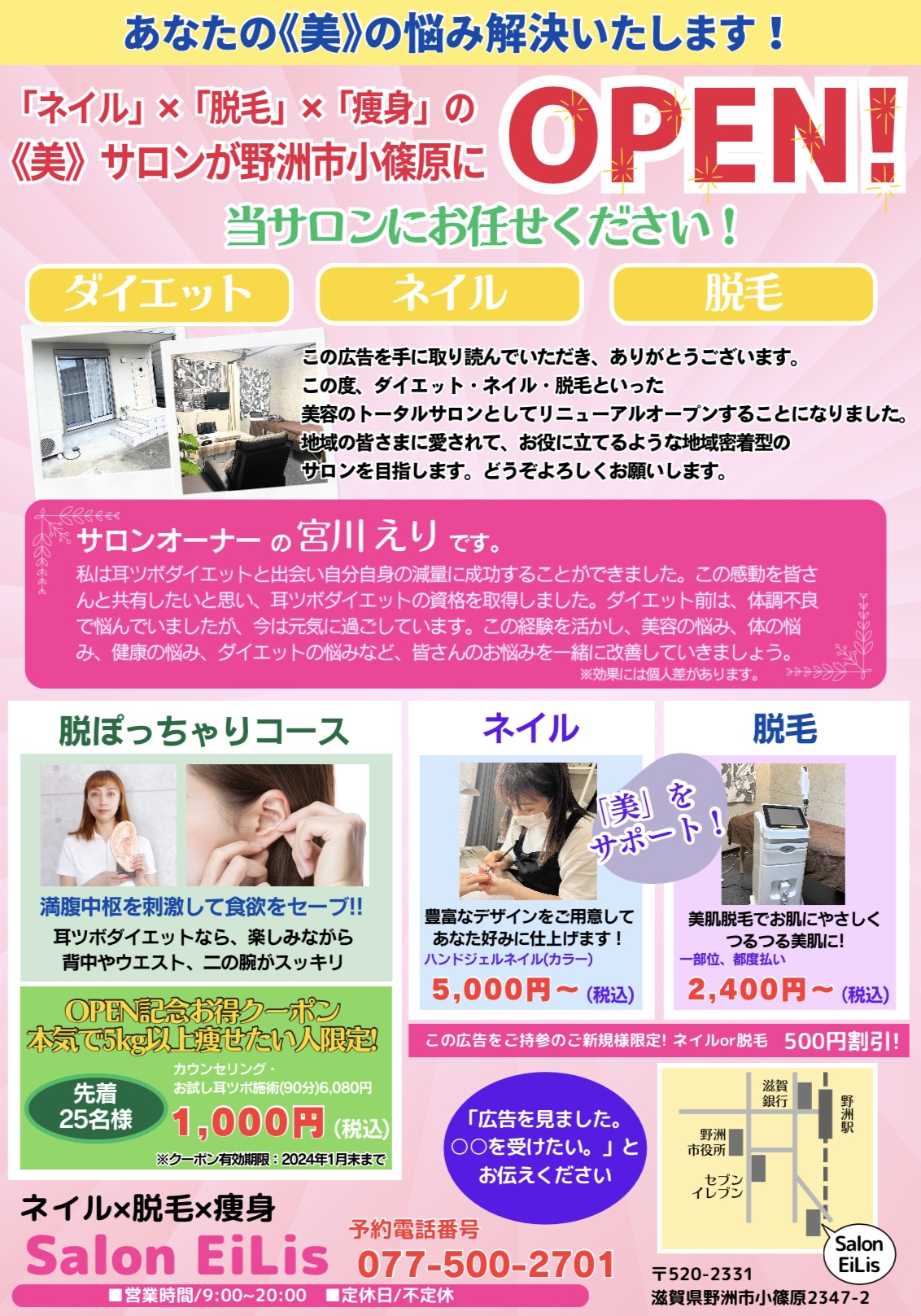 滋賀県野洲市で美容サロン様より新聞折込のご依頼を頂きました!リニューアルオープンのご案内
