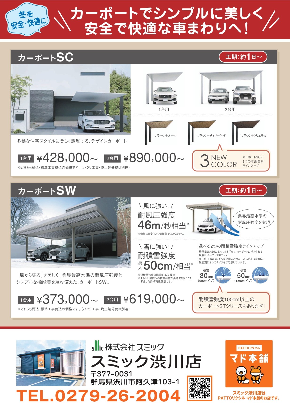 チラシ内容:イベント開催・会社案内・カーポートのご案内
