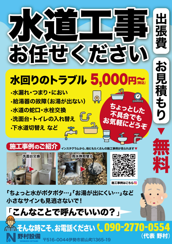 こんにちは💁♀️ 三重県伊勢市で水道業者様より新聞折込広告のご依頼を頂きました! チラシの内容は水回りのお悩み相談です。 〇お客様情報(敬称略)野村設備住所:三重県伊勢市前山町1365-19お問い合わせ先:090277 …