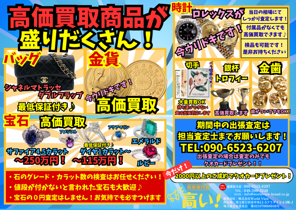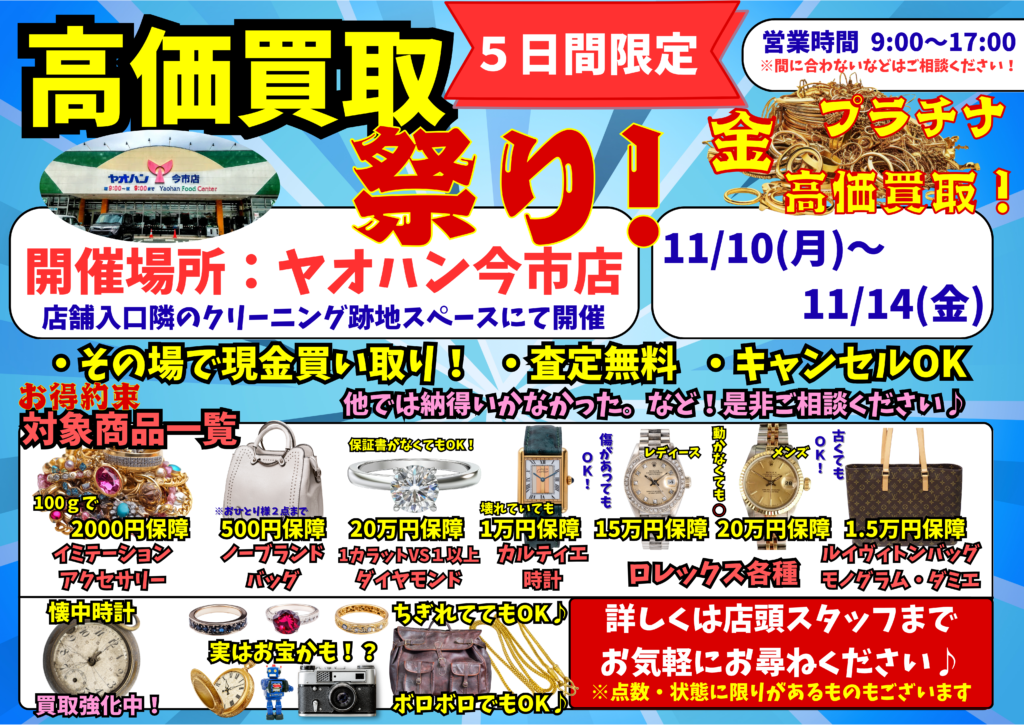 チラシ内容:高価買取祭り・買取商品のご案内※ほぼ前回同様(期間延長)