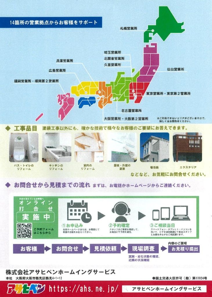 〇お客様情報(敬称略)株式会社アサヒペンホームイングサービス住所:大阪市鶴見区鶴見4-1-12 アサヒペン本社ビル6Fお問い合わせ先:https://ahs.ne.jp/・チラシをご覧になってご興味がございましたら、ぜひ …