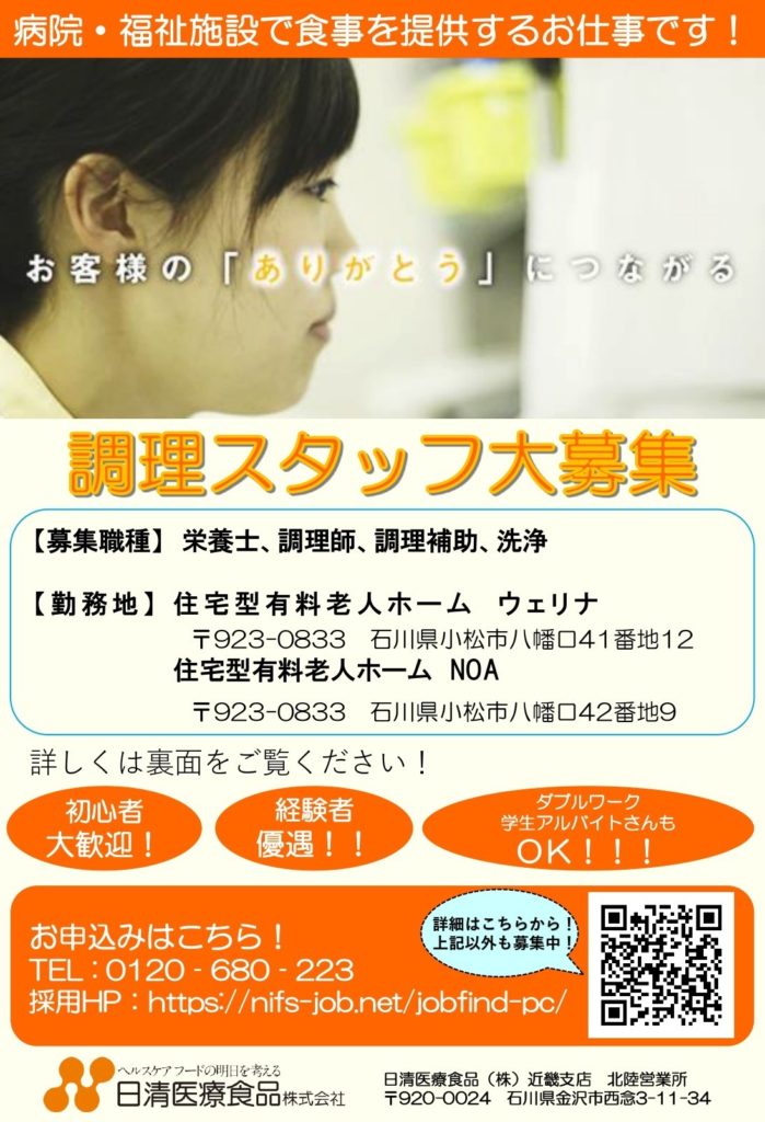 こんにちは、みらい新聞折込です。 石川県羽咋市、かほく市、河北郡、羽昨郡、鹿島郡、鳳珠郡で給食受託会社様より新聞折込のご依頼を頂きました! 〇お客様情報(敬称略)日清医療食品株式会社 近畿支店 北陸営業所住所:石川県金沢 …