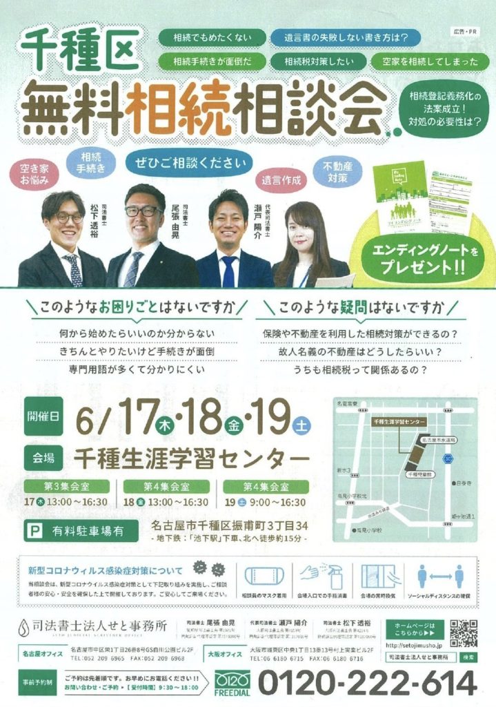 〇お客様情報(敬称略)司法書士事務所せと事務所住所:愛知県名古屋市中区栄1-26-8GS白川公園2F(更新済み)お問い合わせ先:0522096965(更新済み)・チラシをご覧になってご興味がございましたら、ぜひご連絡(訪 …
